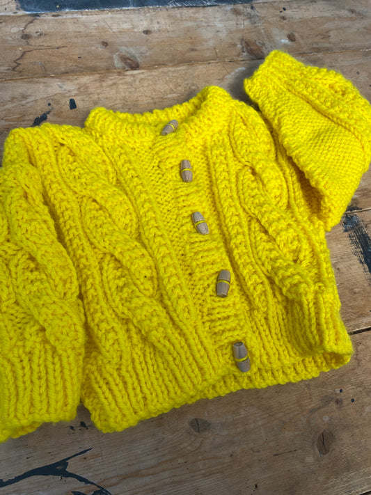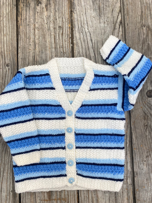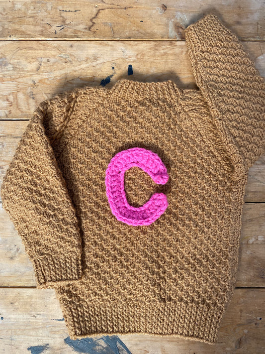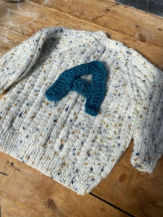 Hand Knitted Kids Cardigans, ages 0-8 Years, ready to be personalised for you with a crochet Monogram Letter.